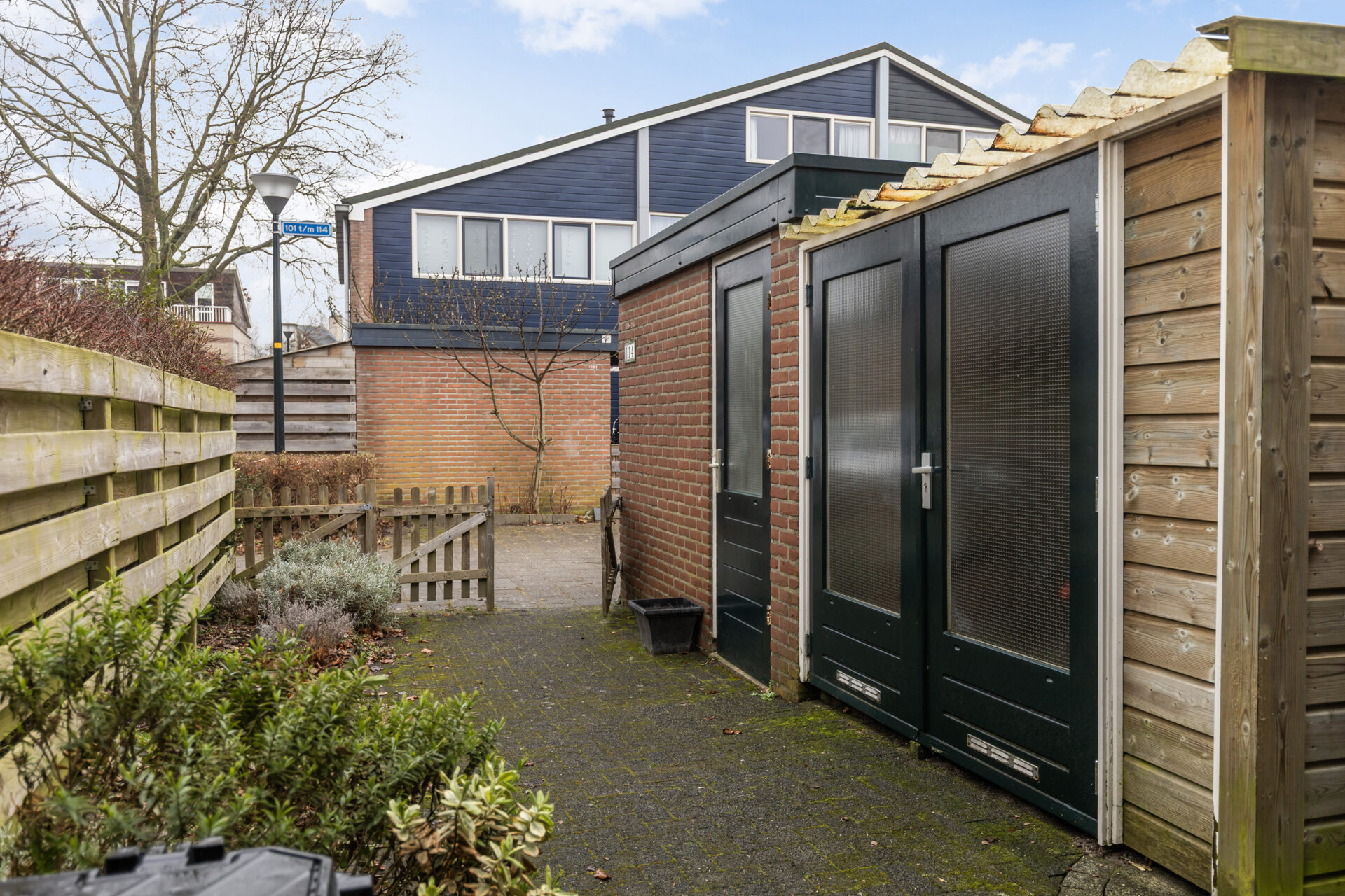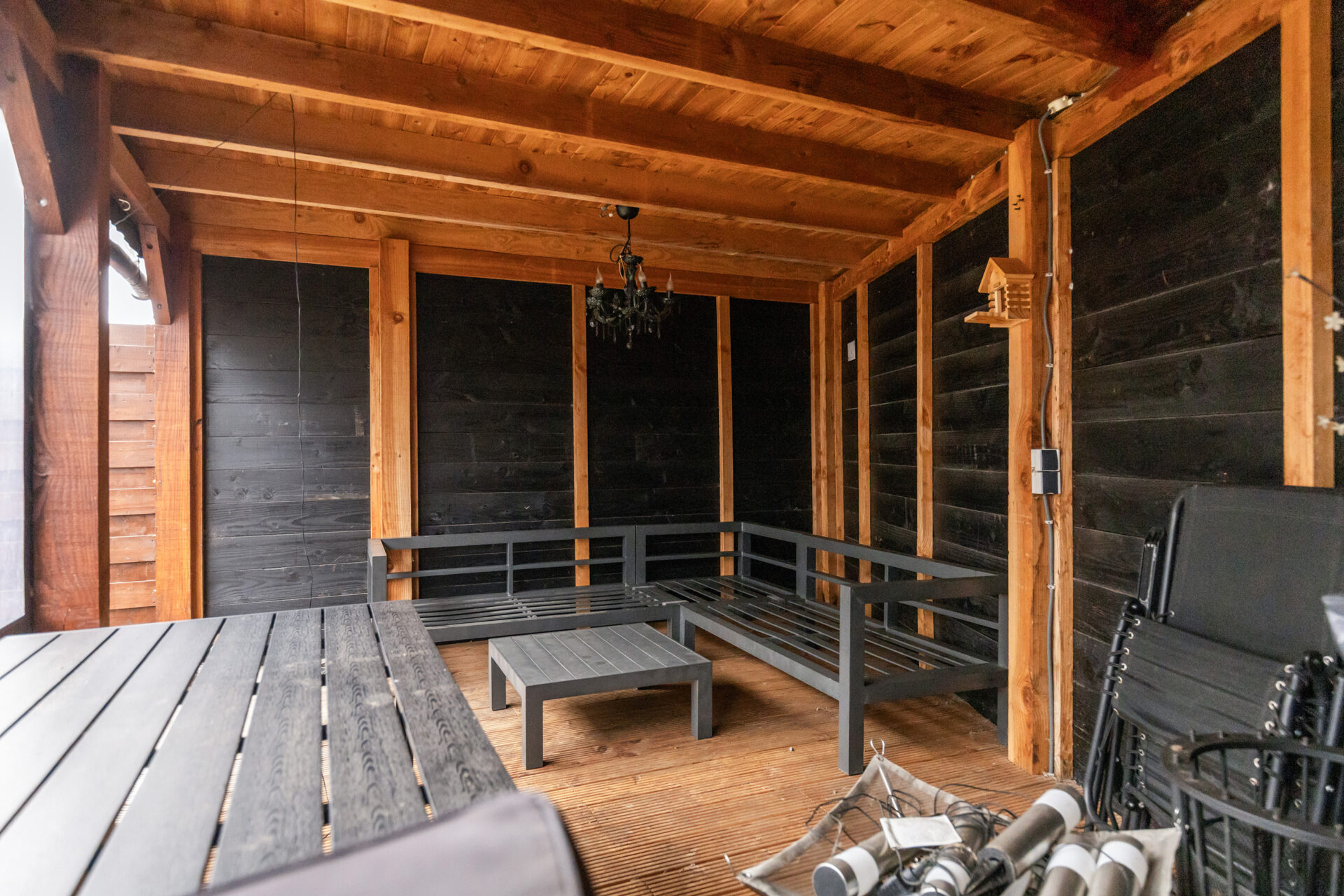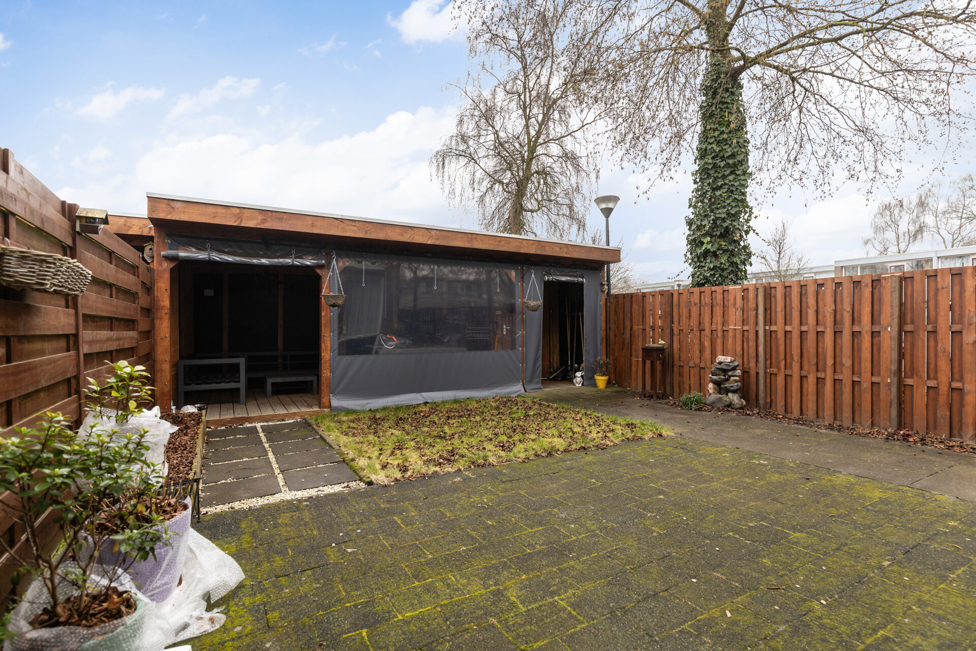 De achtertuin ligt op het oosten en is ingericht met een terras en gazon. De grote veranda met elektra zorgt voor een fijne overdekte zitplek. Daarnaast is er een kleine houten berging en een achterom aanwezig.