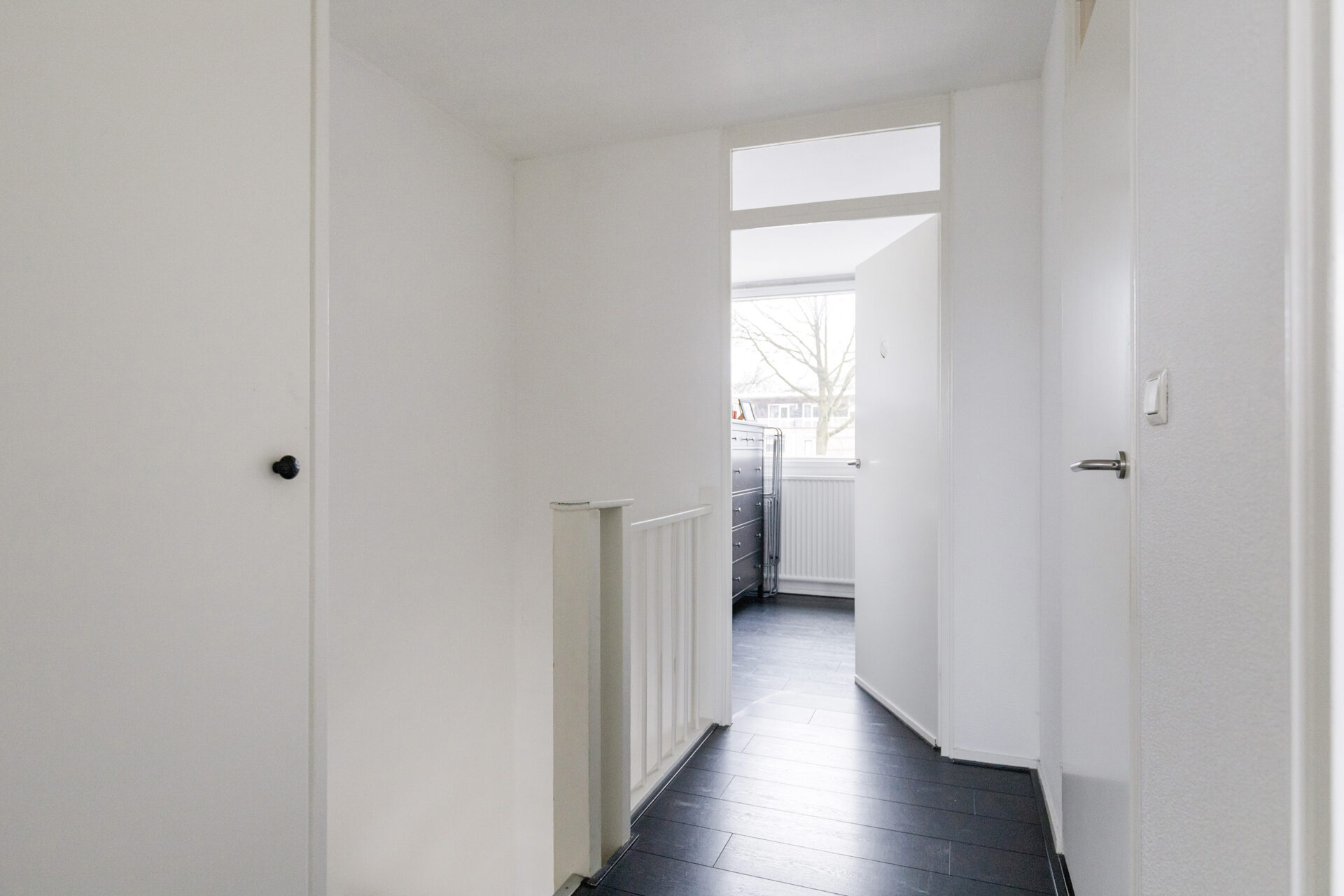 Eerste verdieping: De overloop met vaste kast biedt toegang tot drie ruime slaapkamers. In de slaapkamer aan de voorzijde is de aansluiting voor de wasapparatuur gerealiseerd. De badkamer is compleet ingericht met een royaal ligbad, tweede toilet, wastafelmeubel en mechanische ventilatie.