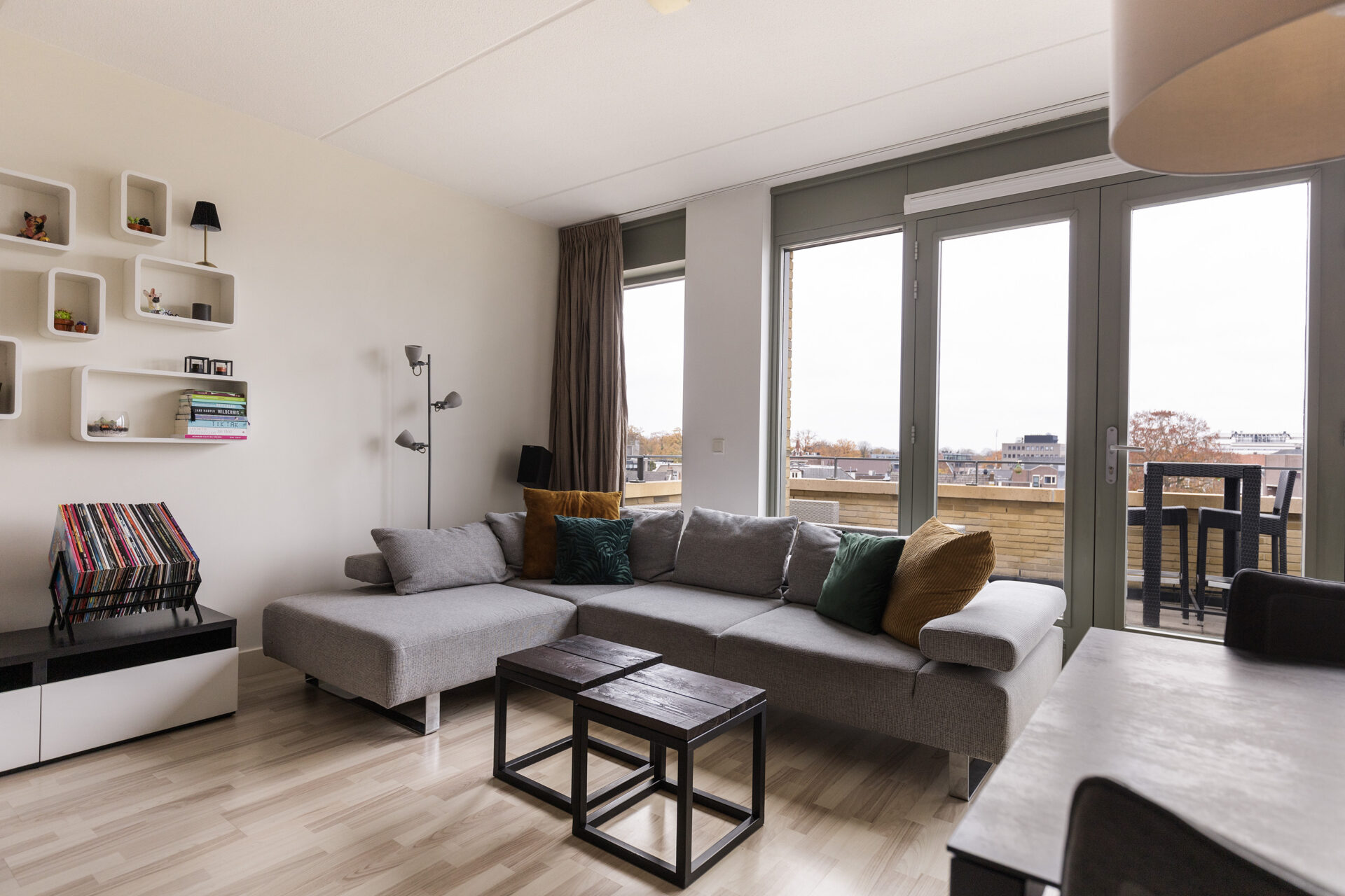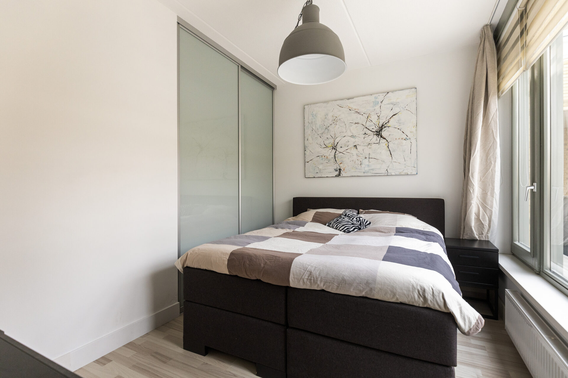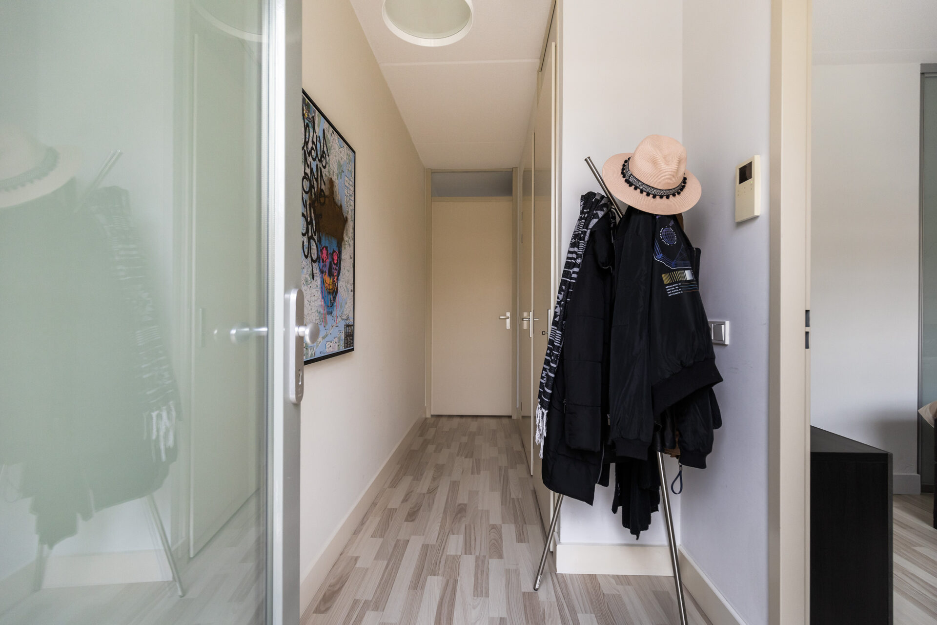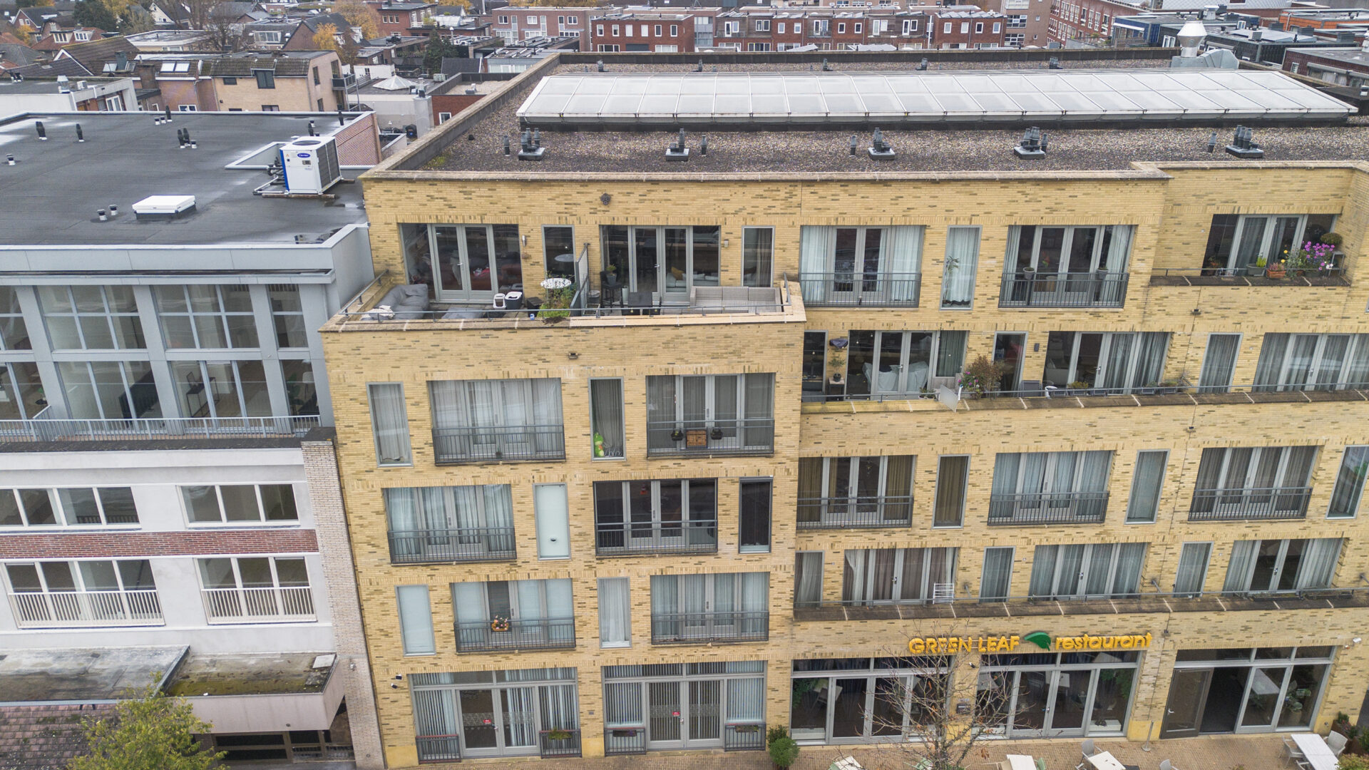 Entree / ruime hal, toegang tot diverse vertrekken. De woonkamer is gelegen aan de voorzijde richting het grote dakterras. De woonkamer is fijn en praktisch van formaat. De grote raampartijen geven een prettige lichtinval en via openslaande deuren is het zeer ruime dakterras bereikbaar. Half open moderne keuken in hoekopstelling voorzien van diverse inbouwapparatuur. Vanuit de woonkamer is een inpandige berging bereikbaar met o.a. de C.V.-ketel opstelling en opslagmogelijkheden. De licht betegelde badkamer is modern en praktisch ingericht, voorzien van douchecabine, wastafelmeubel en toilet. Ruime slaapkamer aan de galerij/atrium zijde van het appartement. De slaapkamer is voorzien van een ruime inbouwkast.