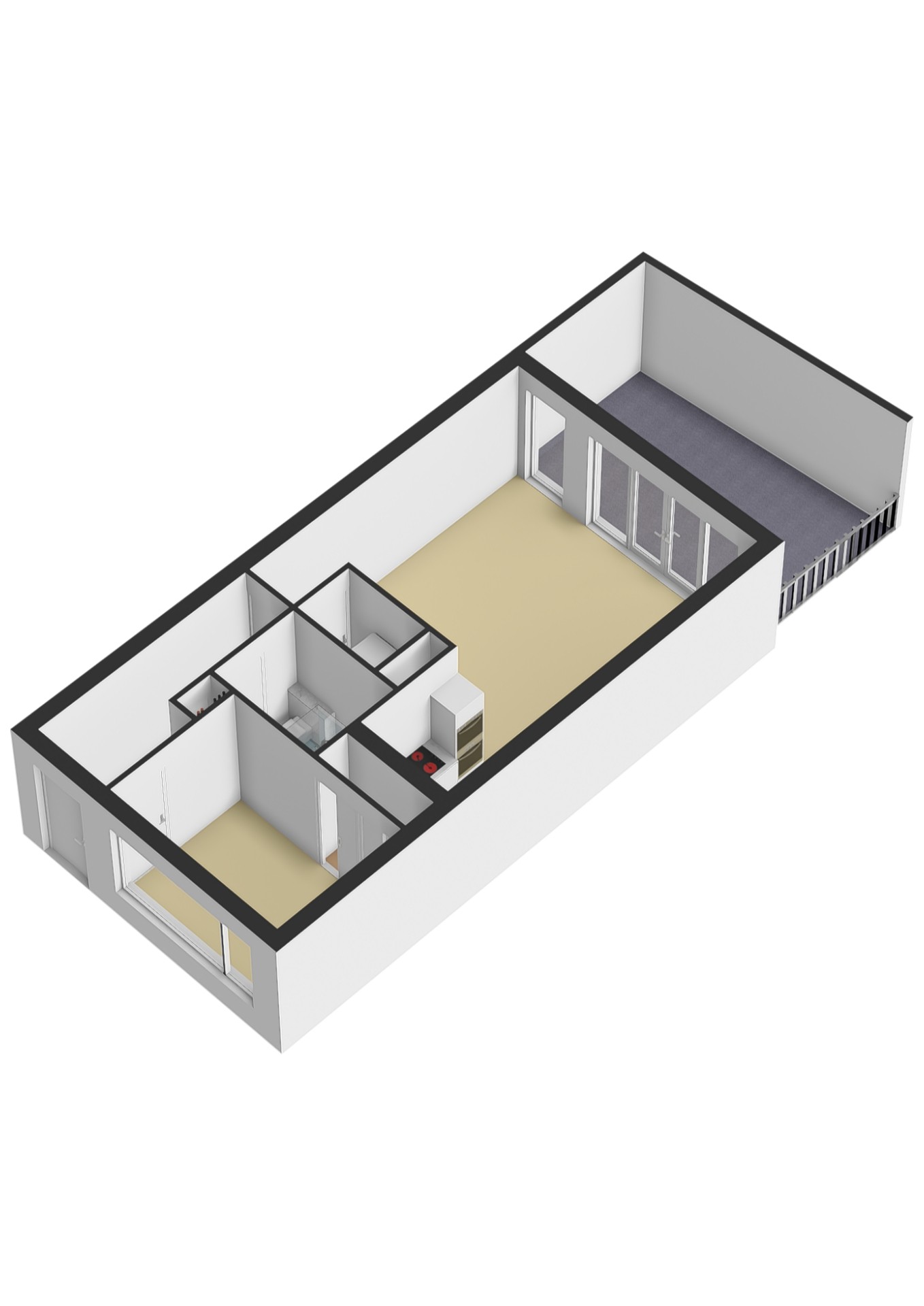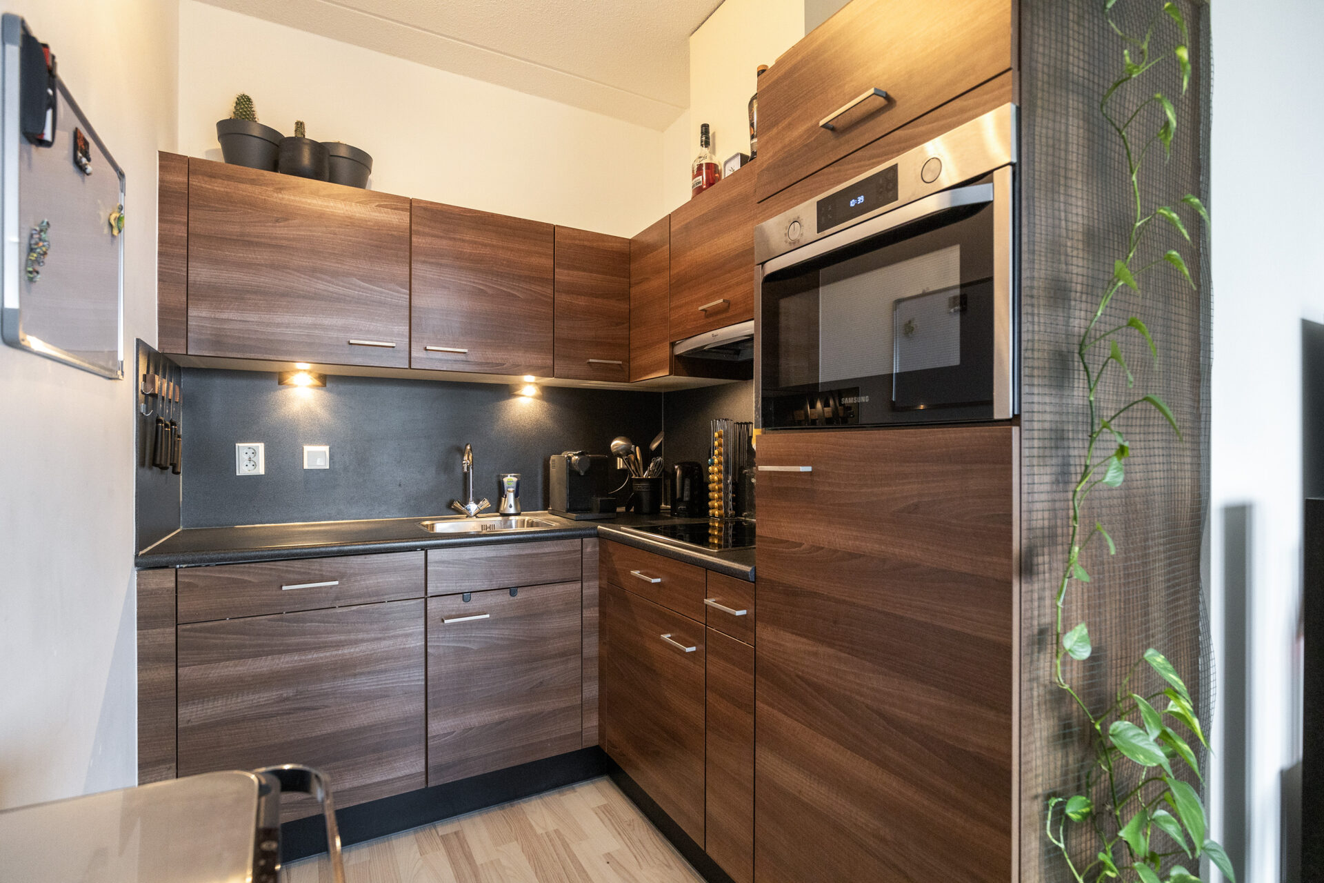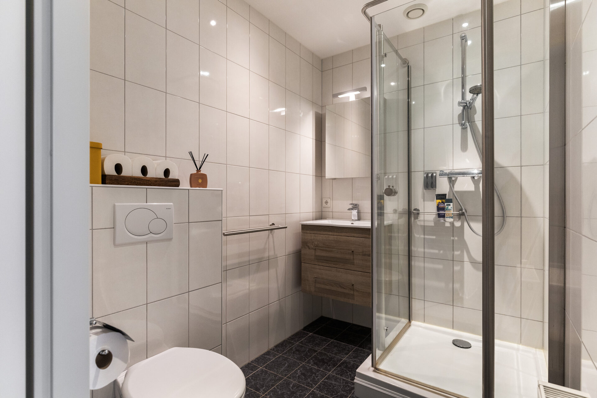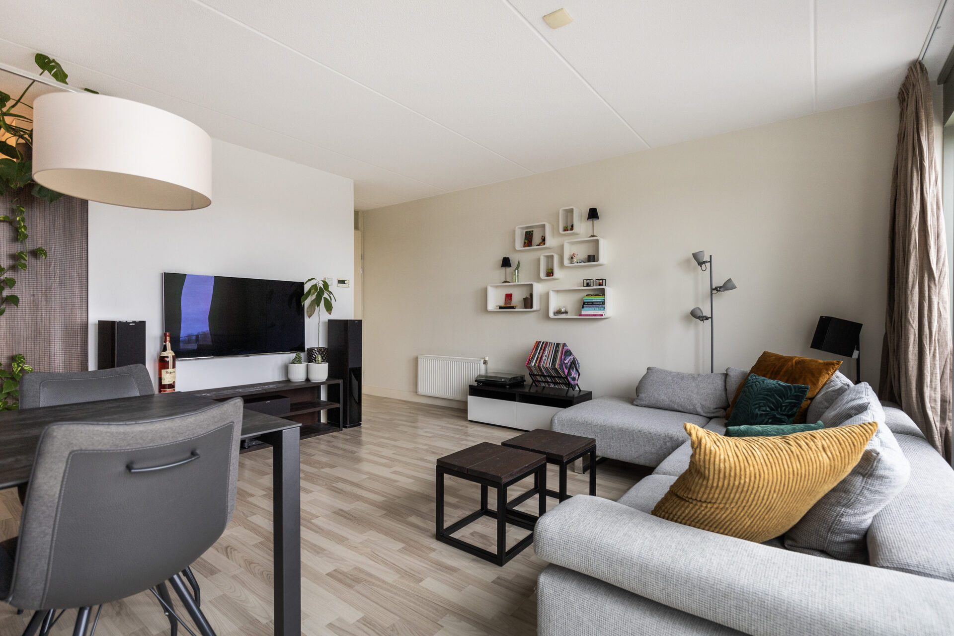 Entree / ruime hal, toegang tot diverse vertrekken. De woonkamer is gelegen aan de voorzijde richting het grote dakterras. De woonkamer is fijn en praktisch van formaat. De grote raampartijen geven een prettige lichtinval en via openslaande deuren is het zeer ruime dakterras bereikbaar. Half open moderne keuken in hoekopstelling voorzien van diverse inbouwapparatuur. Vanuit de woonkamer is een inpandige berging bereikbaar met o.a. de C.V.-ketel opstelling en opslagmogelijkheden. De licht betegelde badkamer is modern en praktisch ingericht, voorzien van douchecabine, wastafelmeubel en toilet. Ruime slaapkamer aan de galerij/atrium zijde van het appartement. De slaapkamer is voorzien van een ruime inbouwkast.