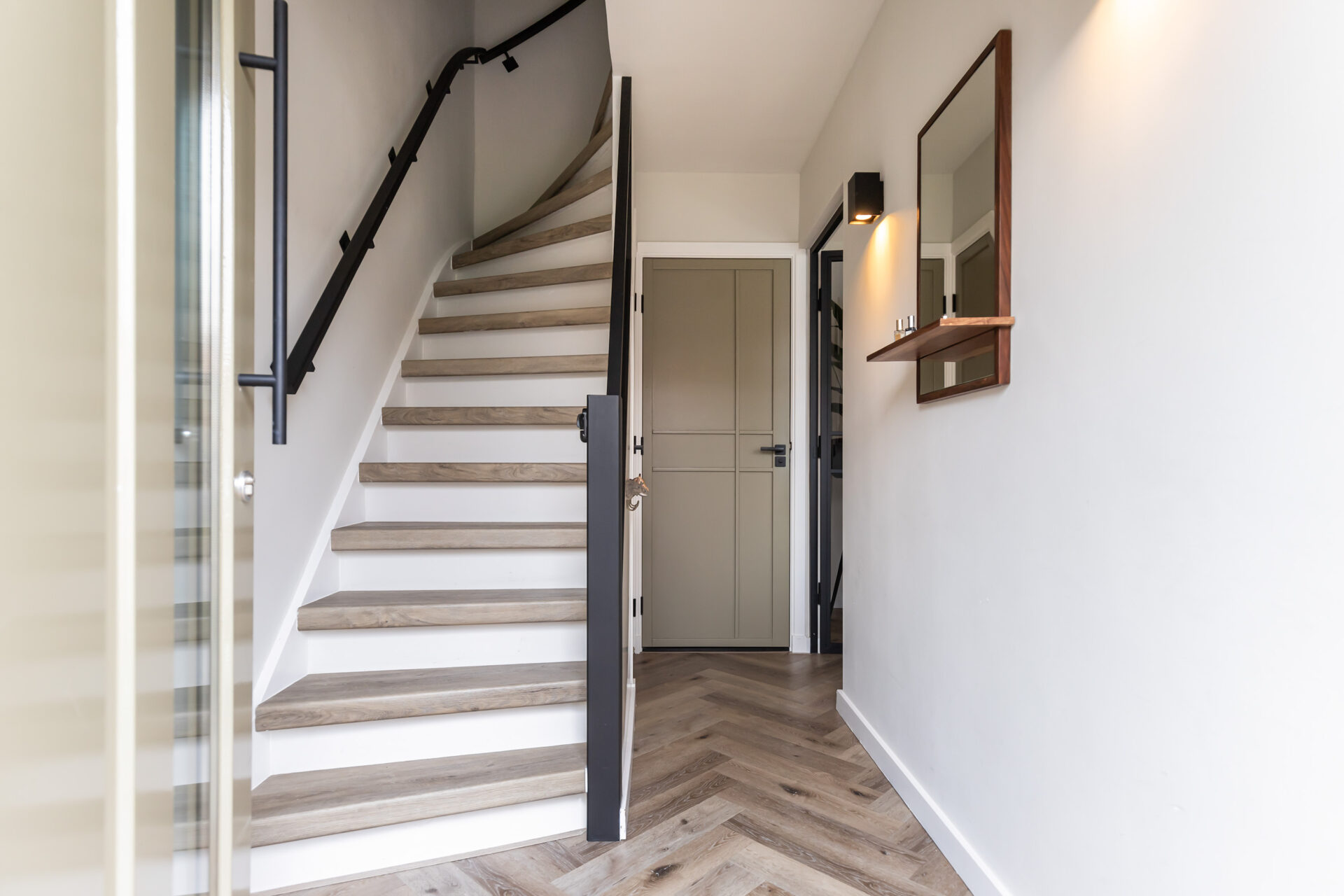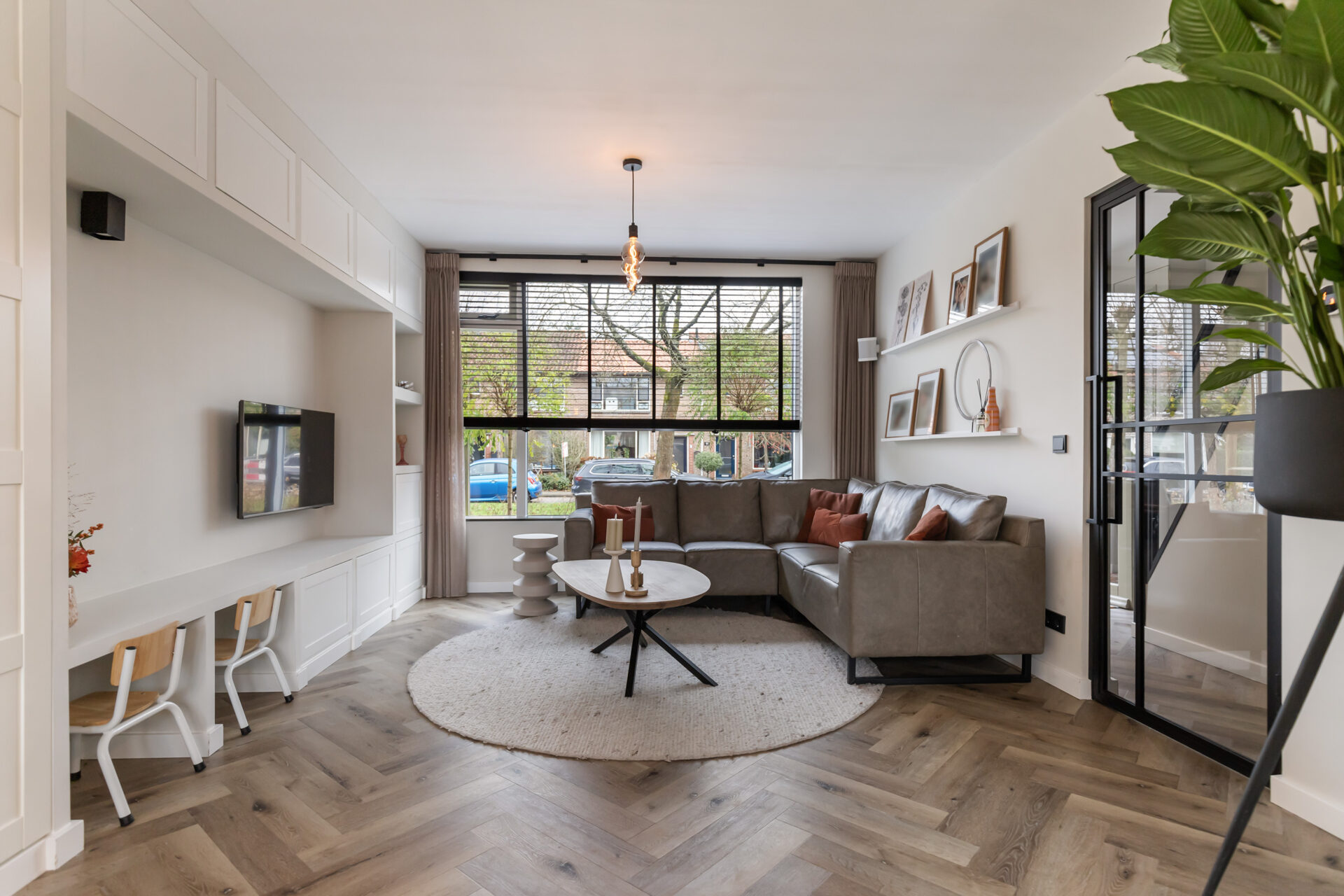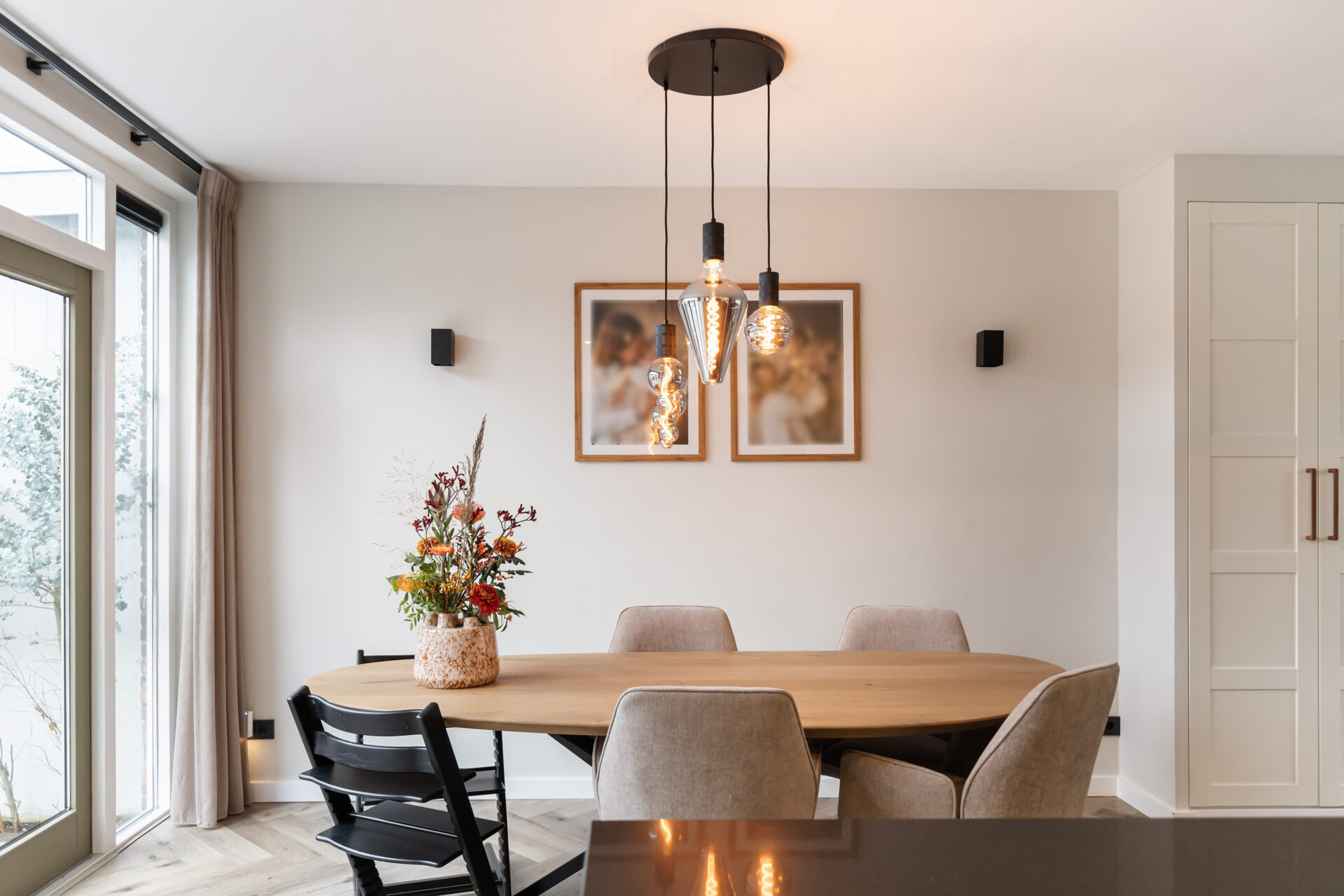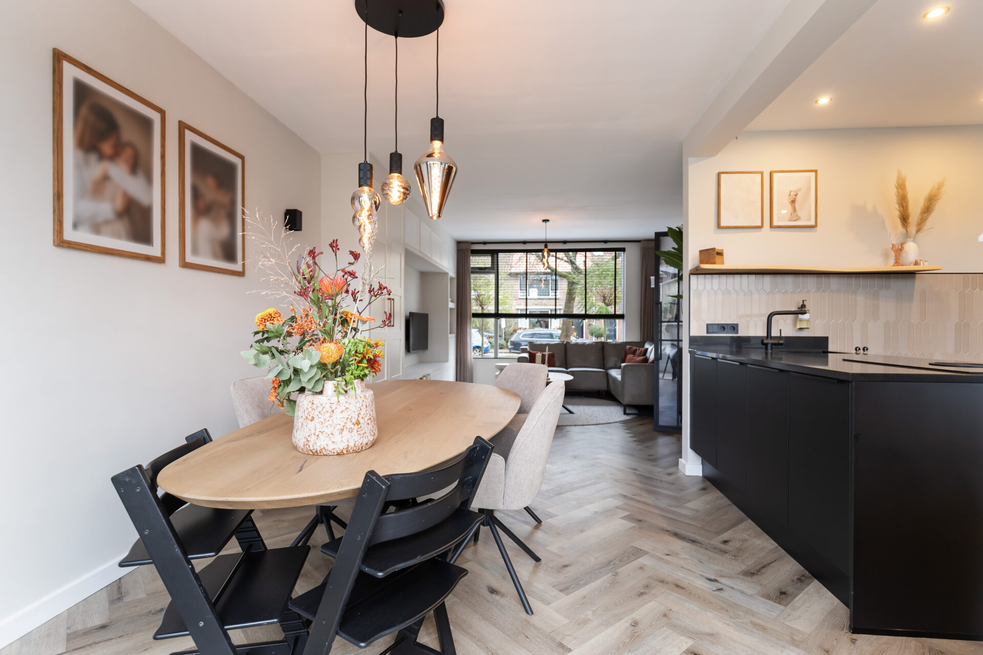 Binnen word je verwelkomd door een lichte en prettige leefruimte. De woonkamer aan de voorzijde voelt ruim en uitnodigend, terwijl de eetkamer aan de achterzijde grenst aan de prachtige open keuken met royaal kookeiland. Hier is gekozen voor hoogwaardige materialen en uitstekende inbouwapparatuur – een ideale plek om te koken, borrelen en samen te komen. Via de dubbele deuren loop je zo de tuin in.