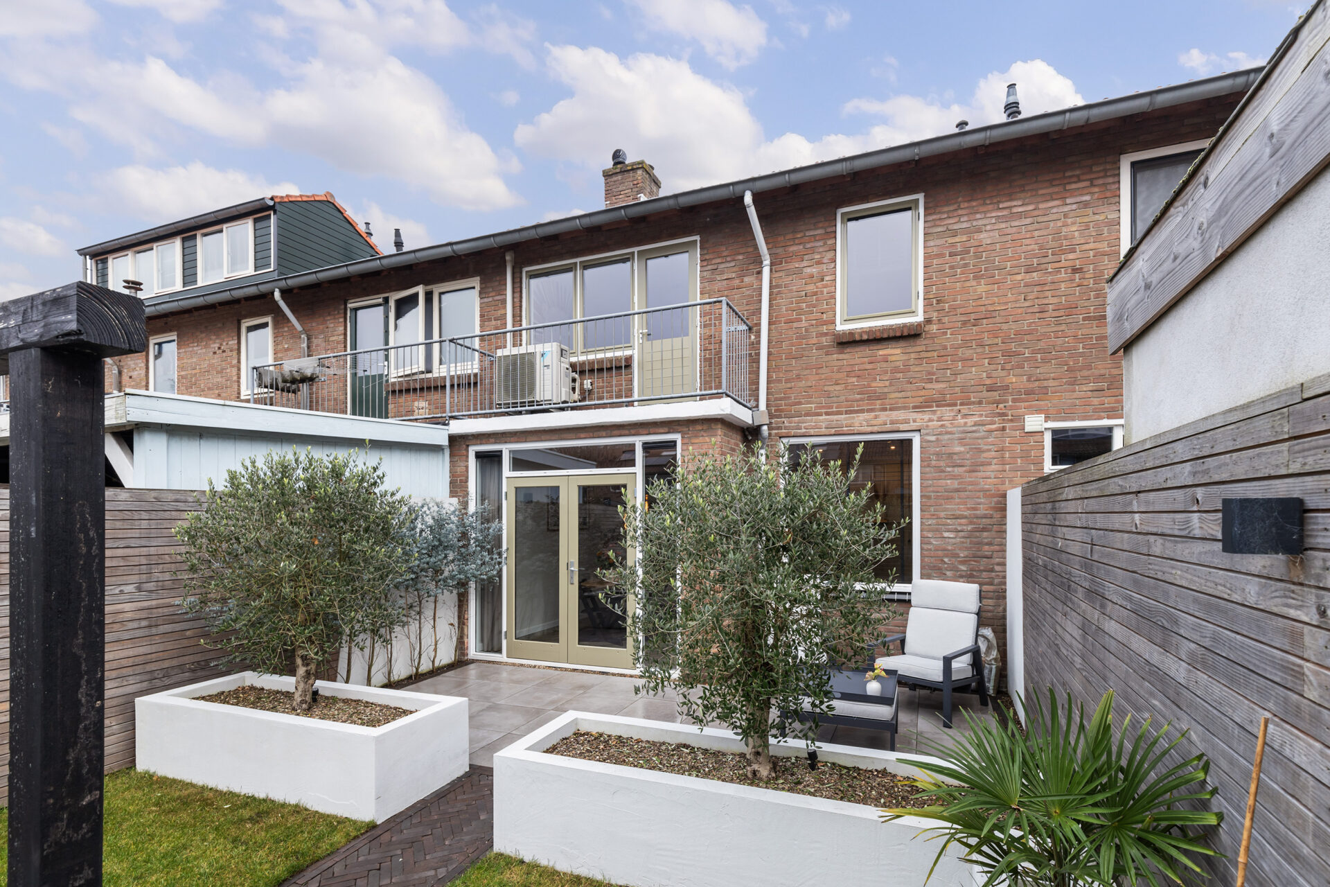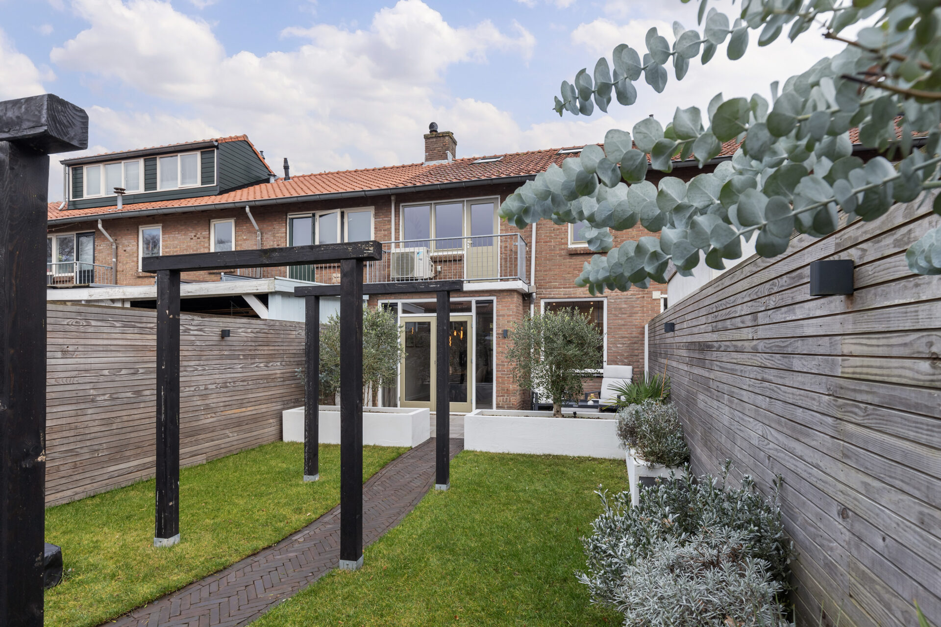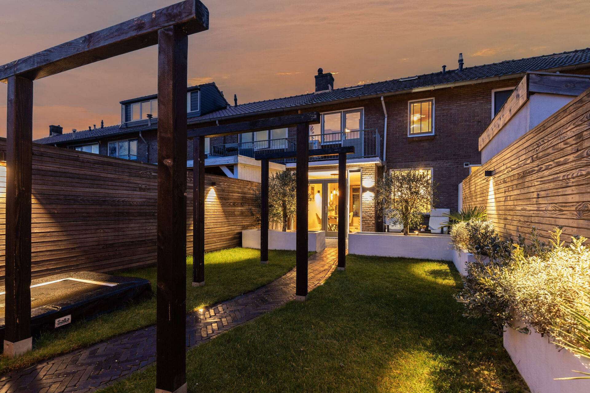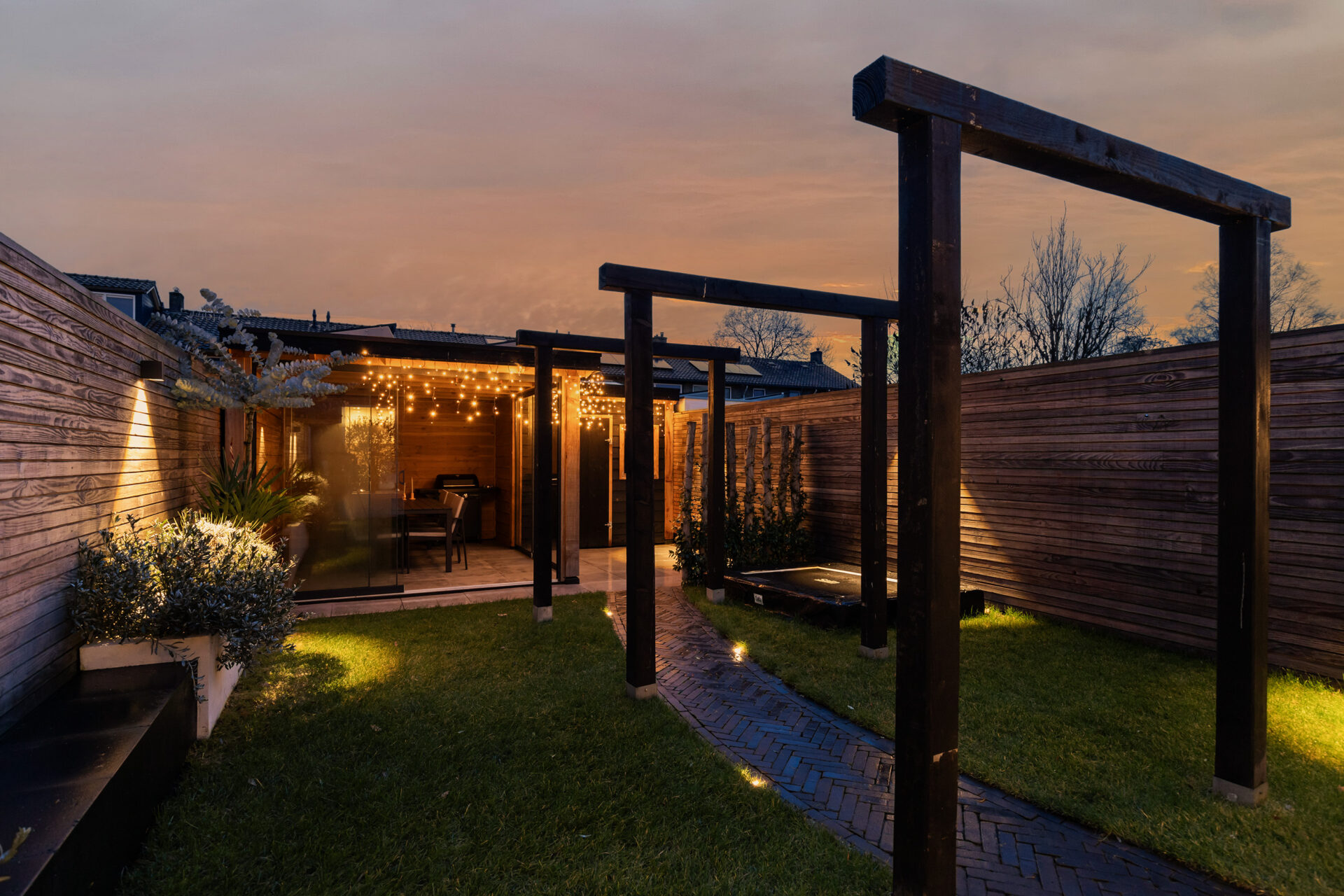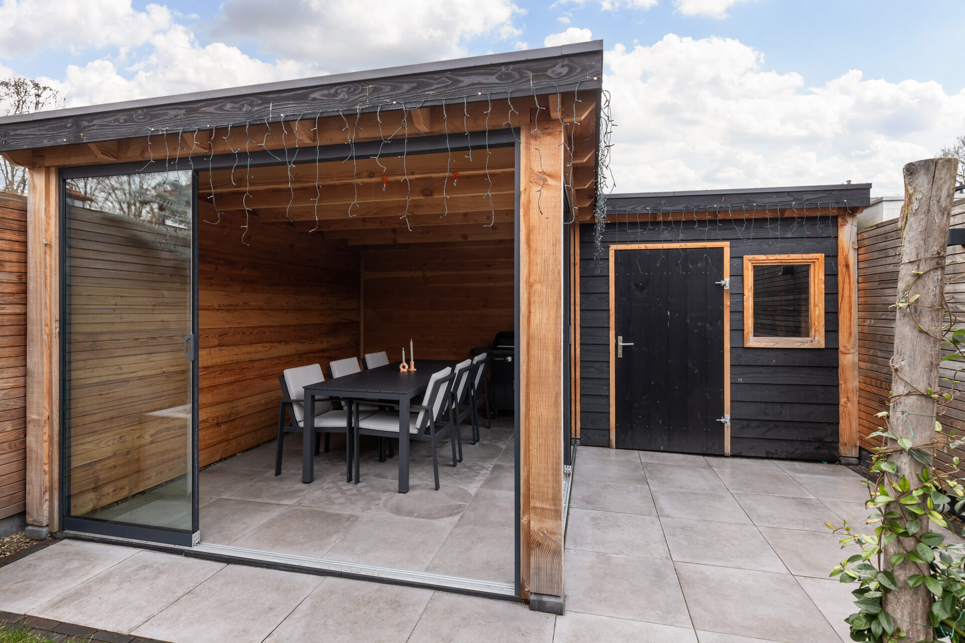 De achtertuin op het westen is strak aangelegd en perfect onderhouden. De sfeervolle houten veranda maakt het een heerlijke plek om al vroeg in het seizoen te genieten van de middag- en avondzon. Achter in de tuin staat een vrijstaande houten berging, ideaal voor fietsen en extra opslag.