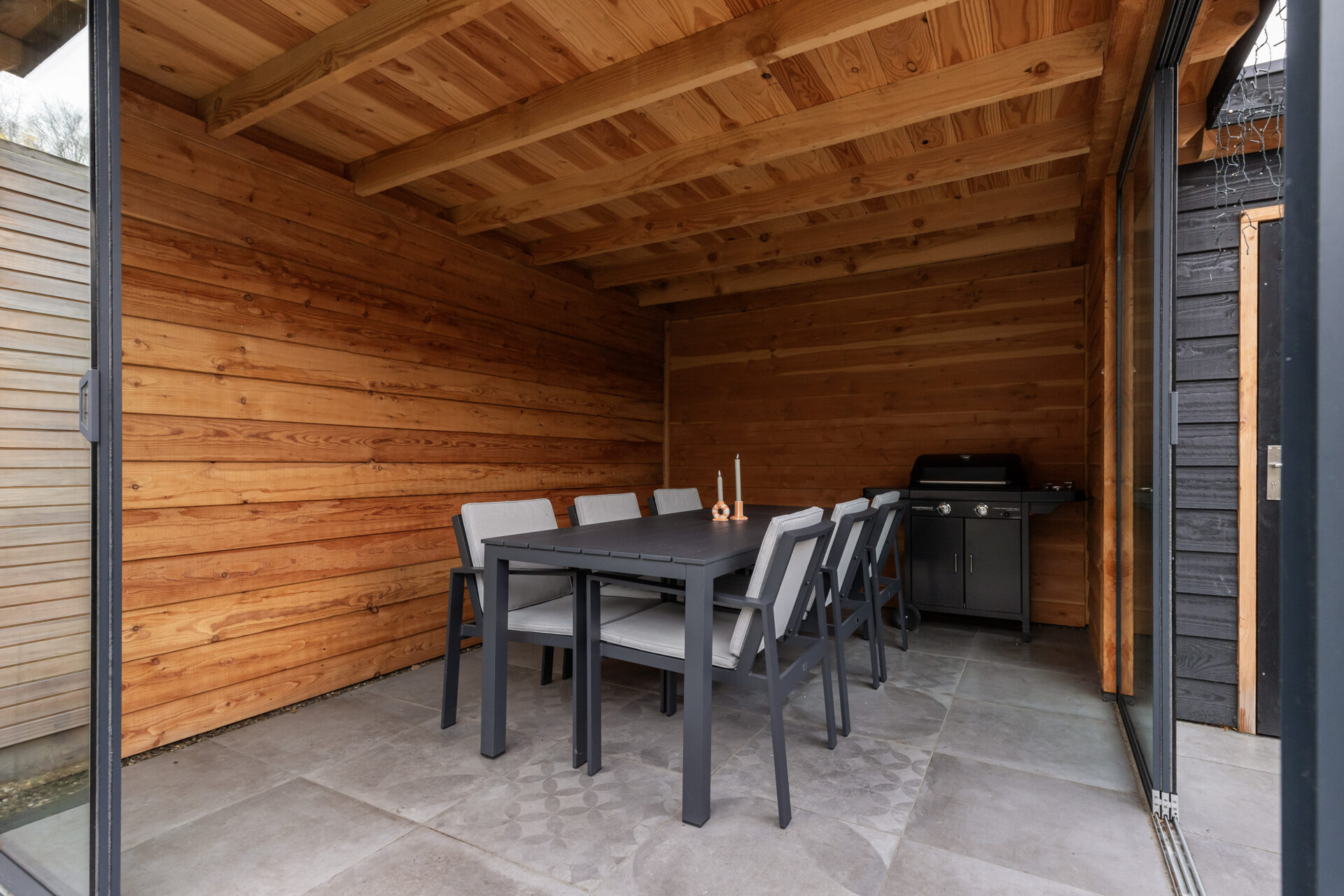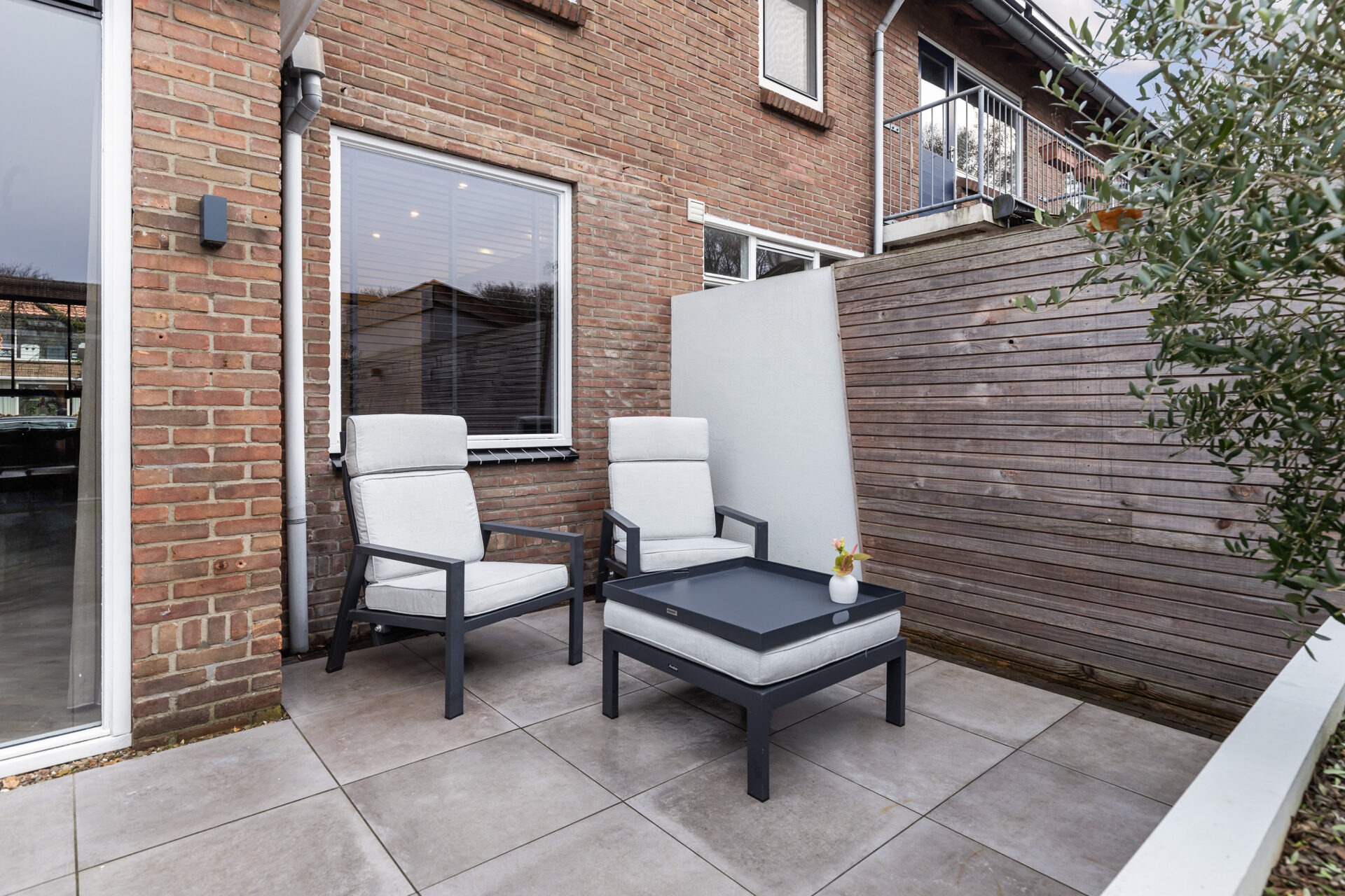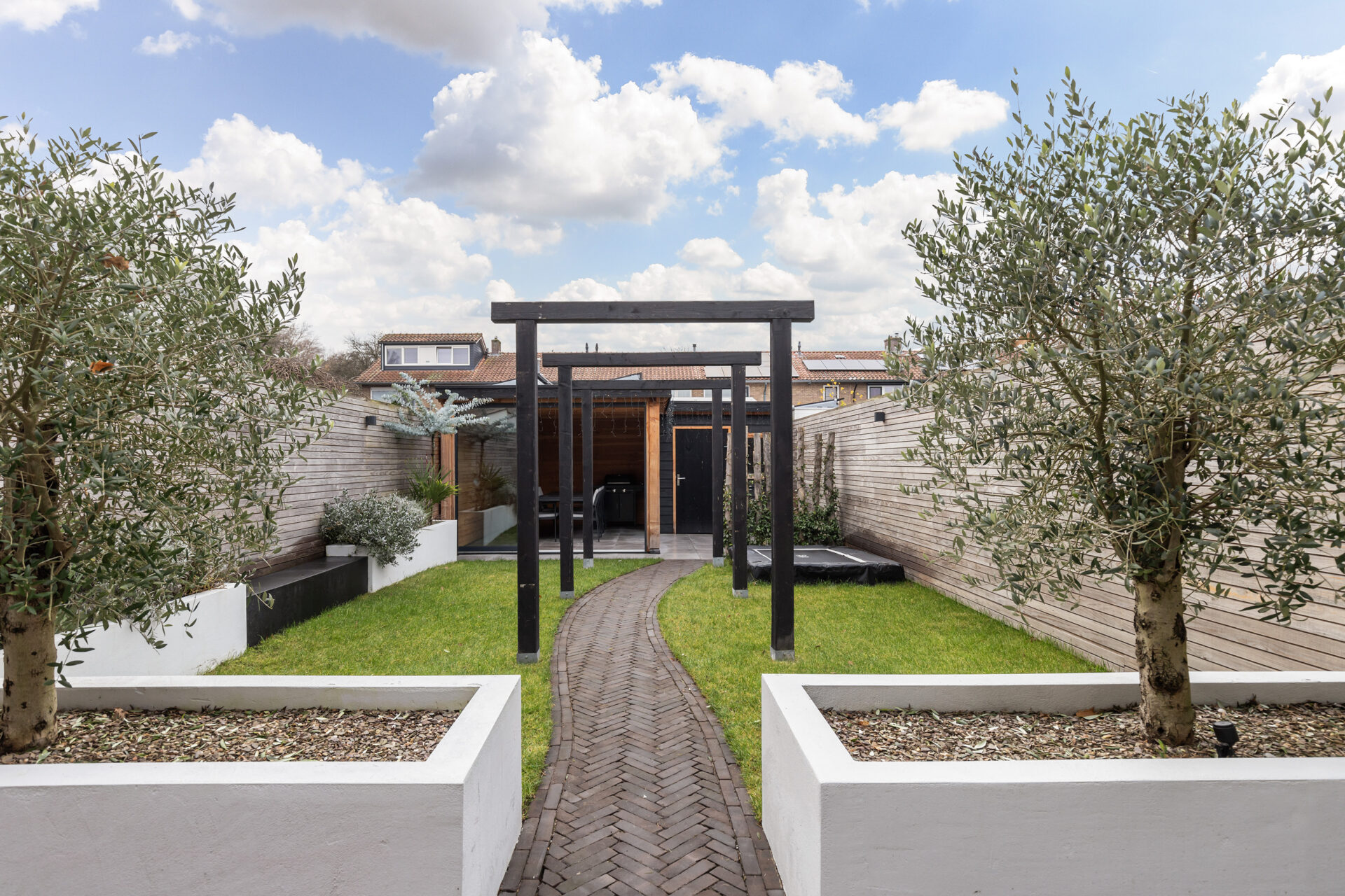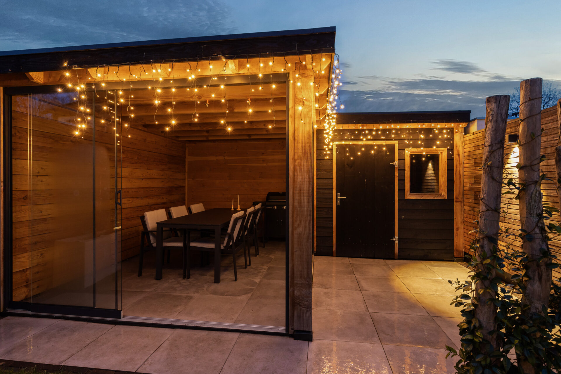De achtertuin op het westen is strak aangelegd en perfect onderhouden. De sfeervolle houten veranda maakt het een heerlijke plek om al vroeg in het seizoen te genieten van de middag- en avondzon. Achter in de tuin staat een vrijstaande houten berging, ideaal voor fietsen en extra opslag.