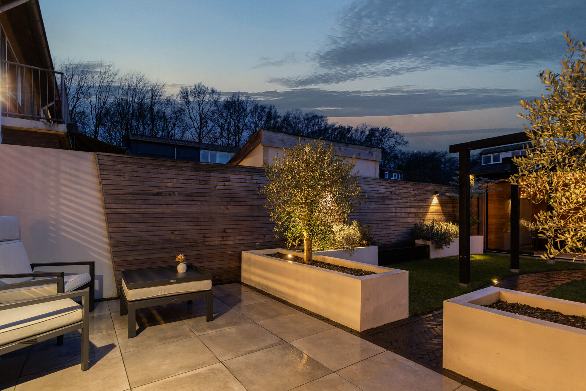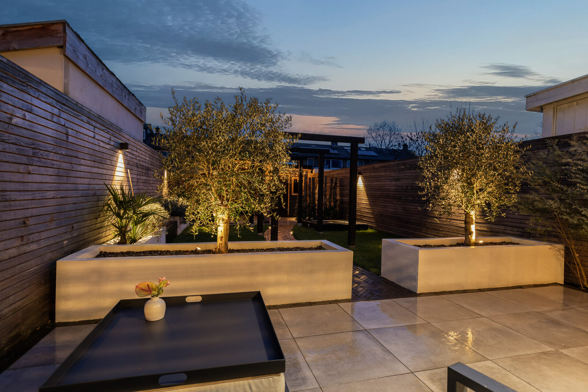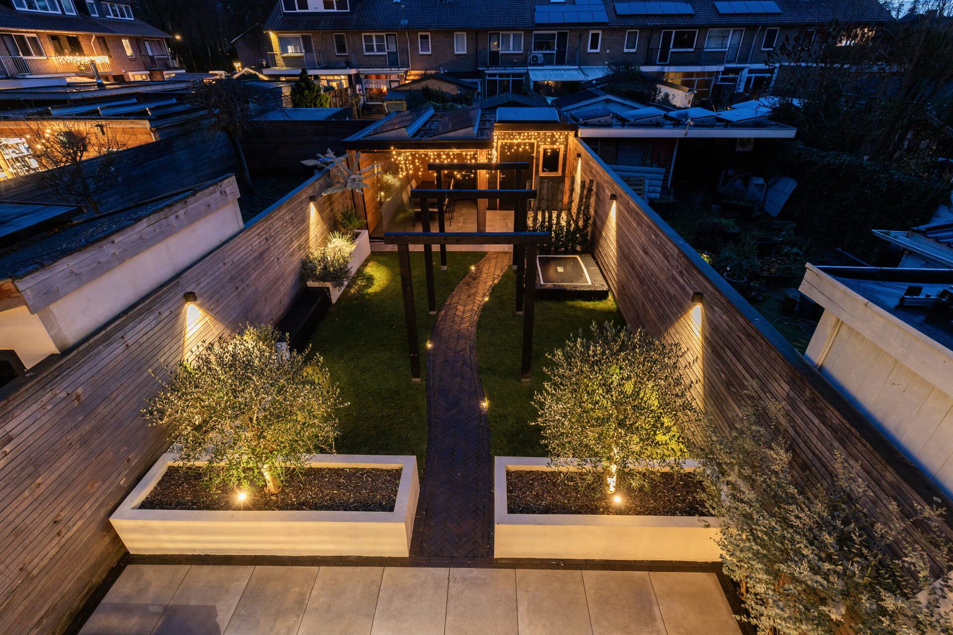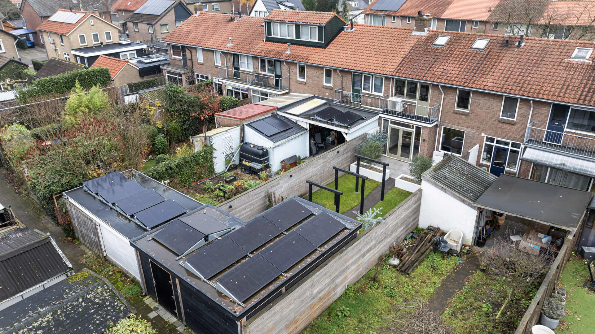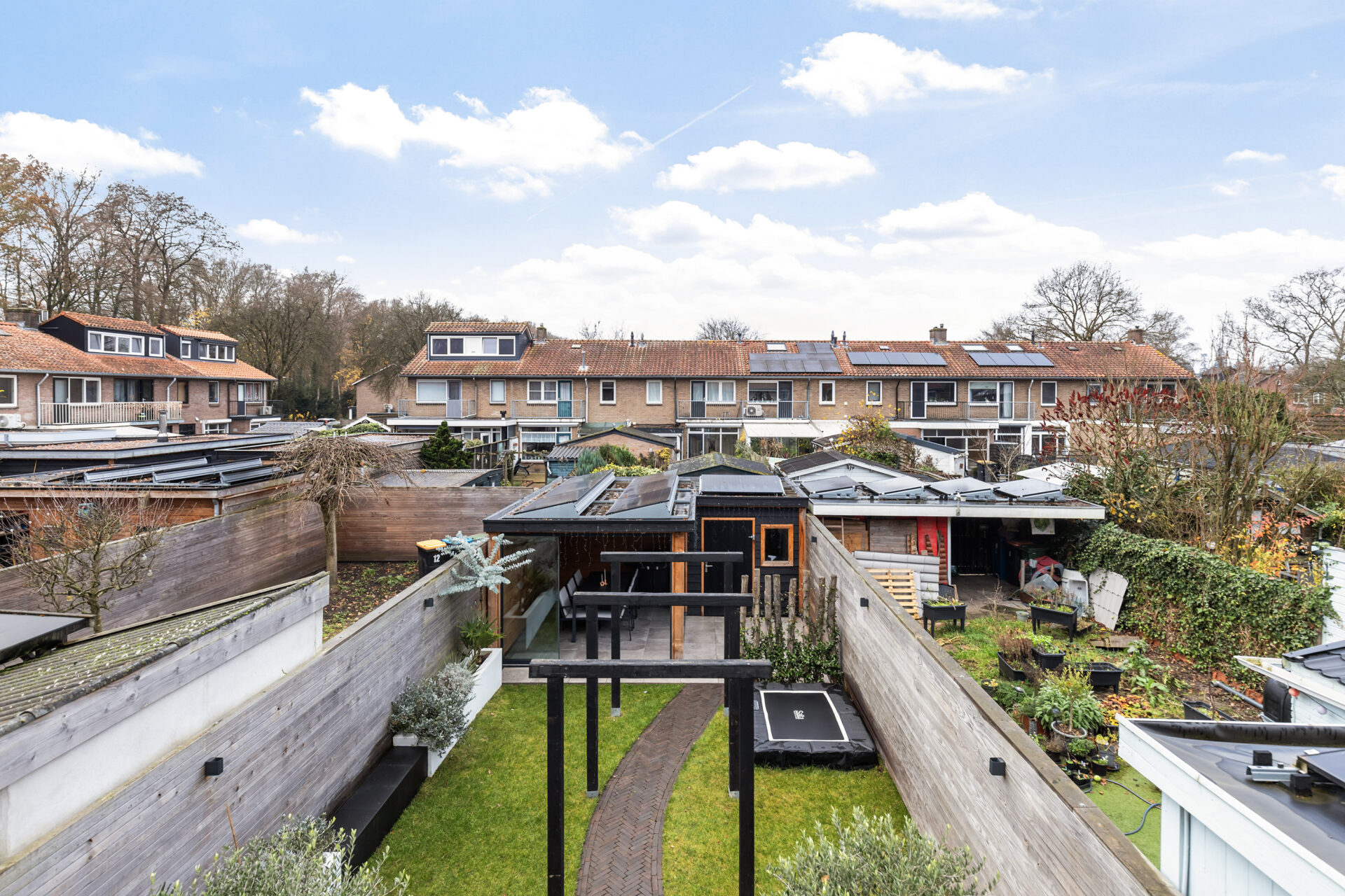 De achtertuin op het westen is strak aangelegd en perfect onderhouden. De sfeervolle houten veranda maakt het een heerlijke plek om al vroeg in het seizoen te genieten van de middag- en avondzon. Achter in de tuin staat een vrijstaande houten berging, ideaal voor fietsen en extra opslag.