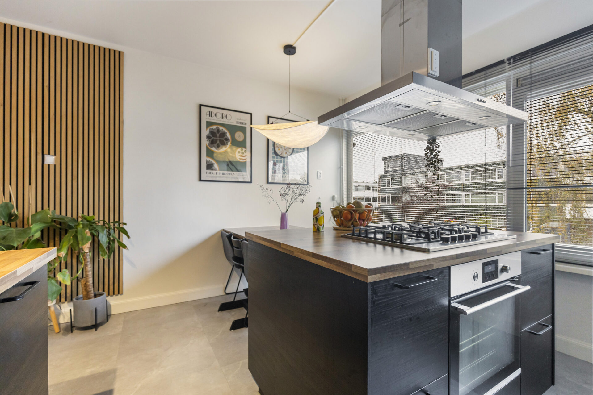 Een lichte, royale woonkamer met grote ramen en toegang tot het zonnige balkon aan de achterzijde. De moderne open keuken is voorzien van diverse inbouwapparatuur en vormt het gezellige hart van deze verdieping.