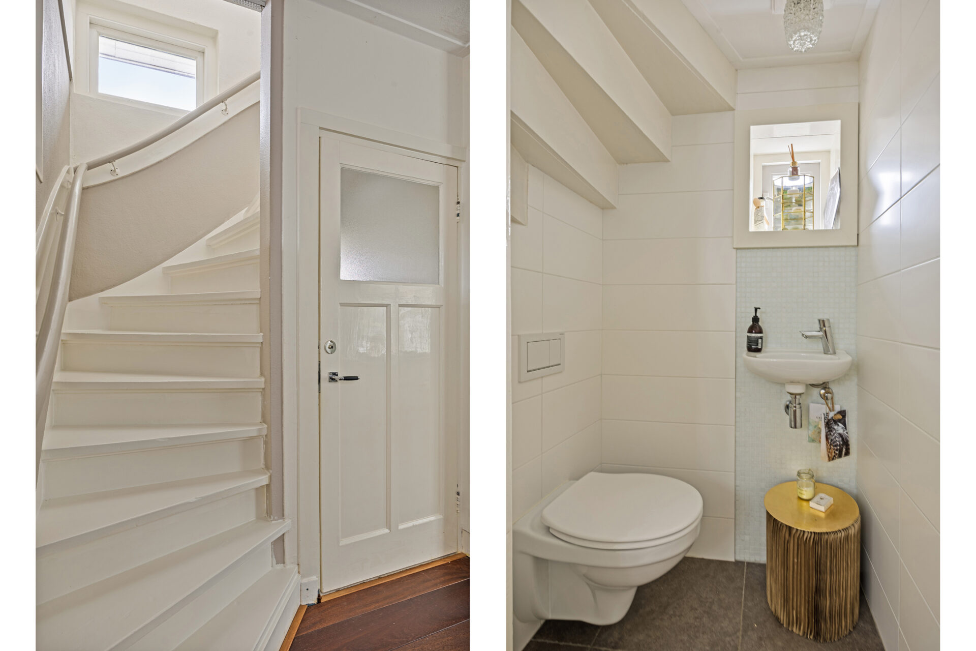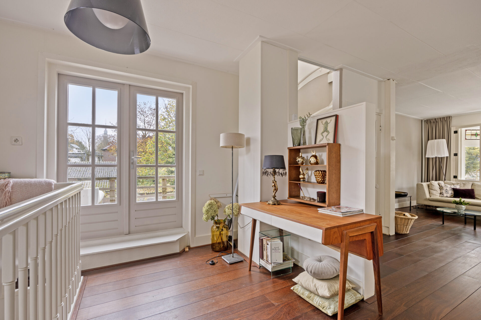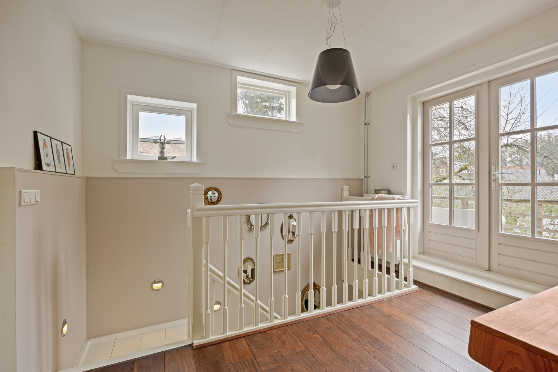Overloop met toegang tot het dakterras via dubbele deuren, een separate toiletruimte en een sfeervolle woonkamer met karakteristieke glas-in-loodramen.