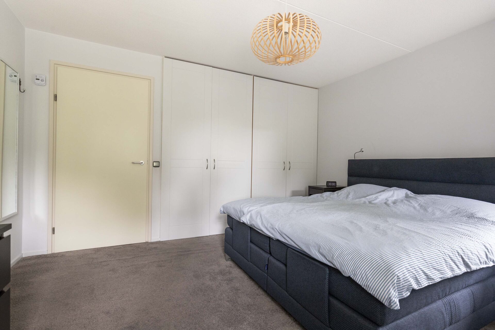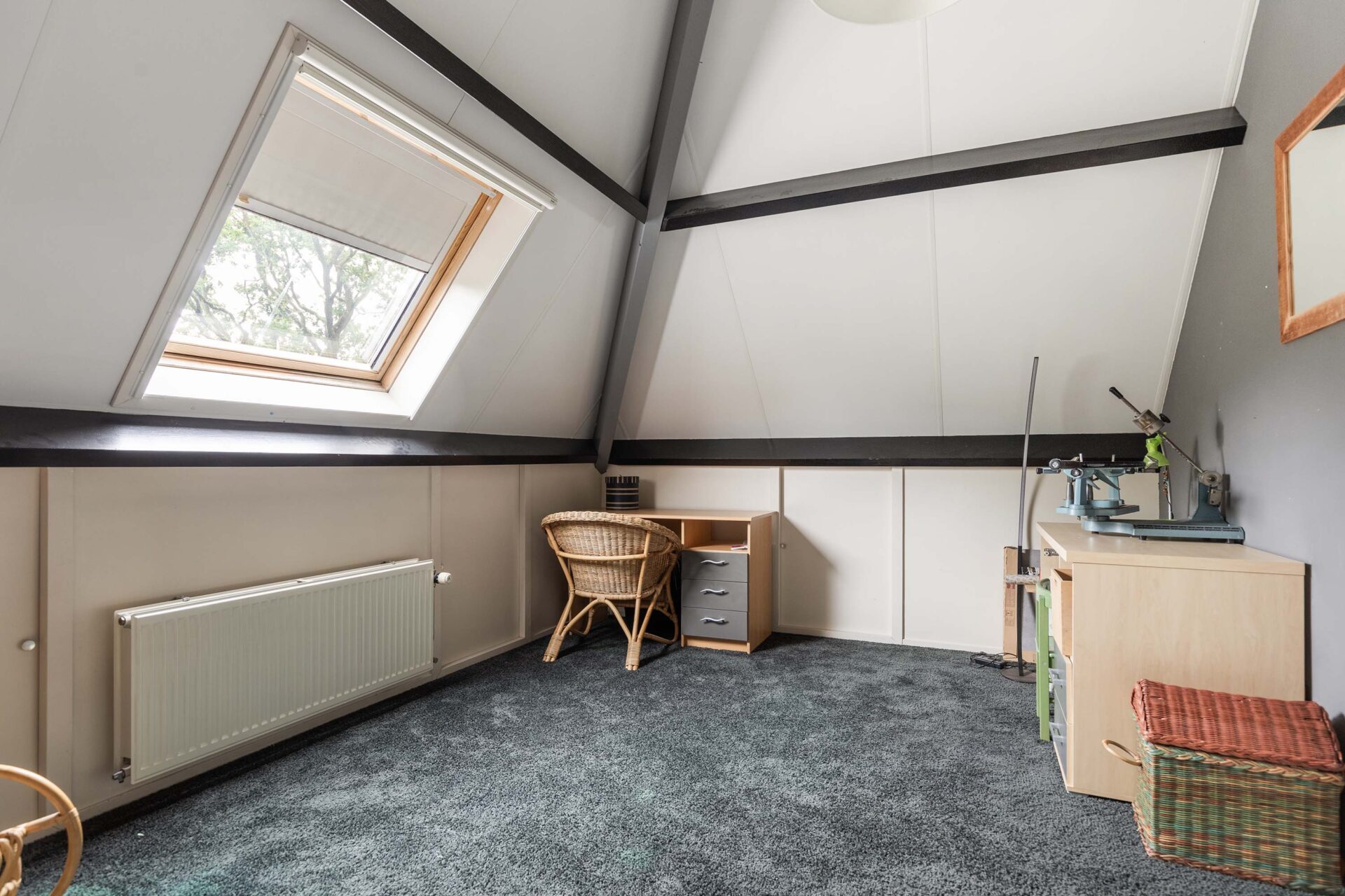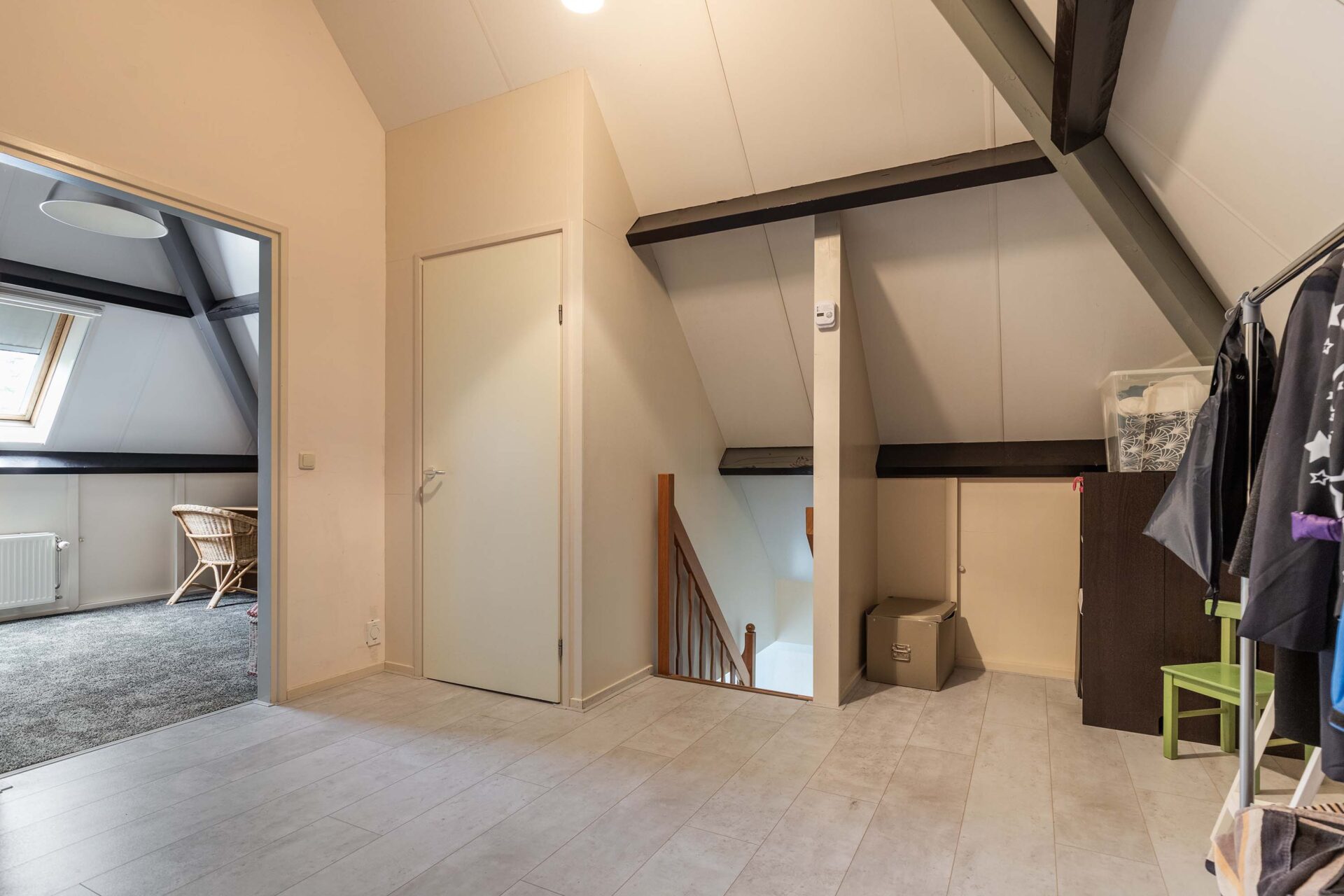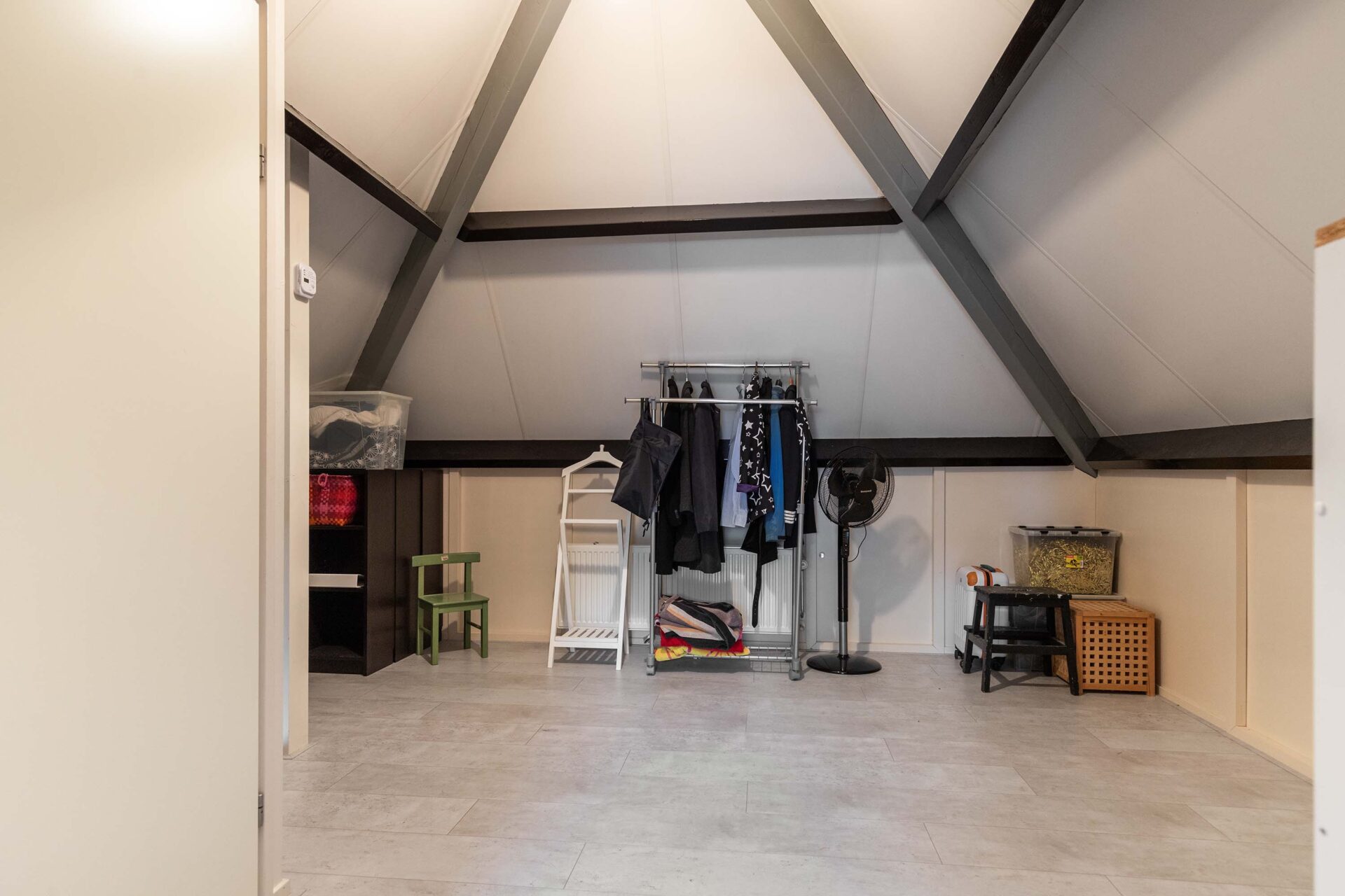 De vaste trap leidt naar een ruime zolderverdieping en een royale slaapkamer (met stahoogte van 3.39 m) met beide veel bergruimte achter de knieschotten. Hier bevindt zich, in een afgesloten ruimte, ook de opstelling van de CV-ketel en de hybride warmtepomp (beide uit 2024).