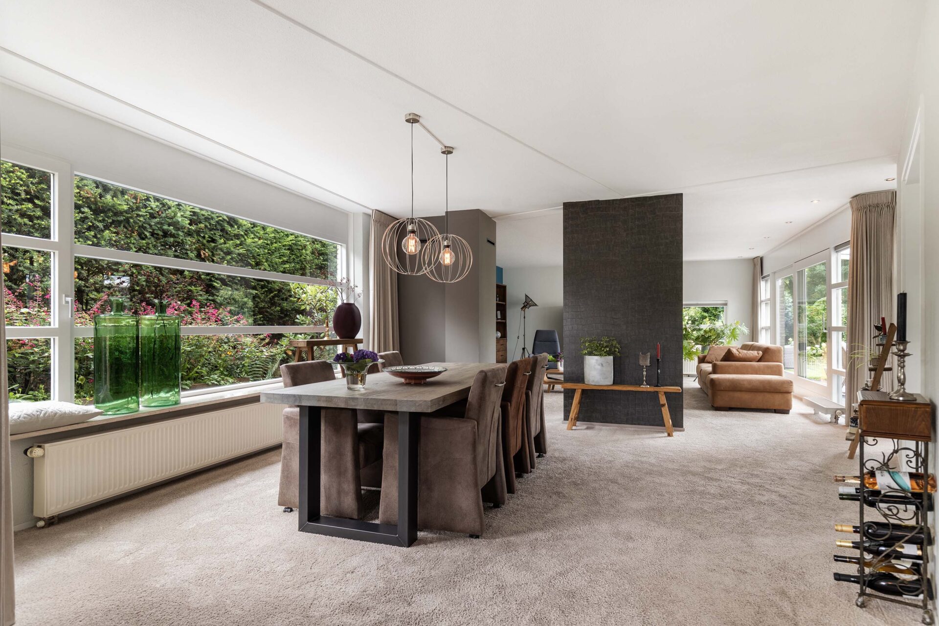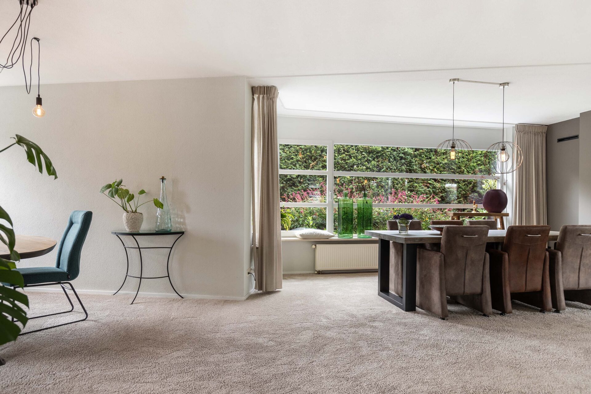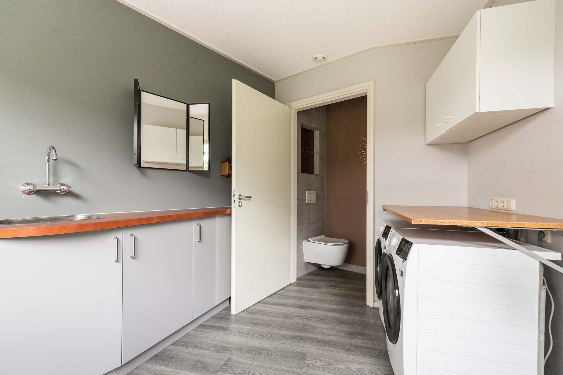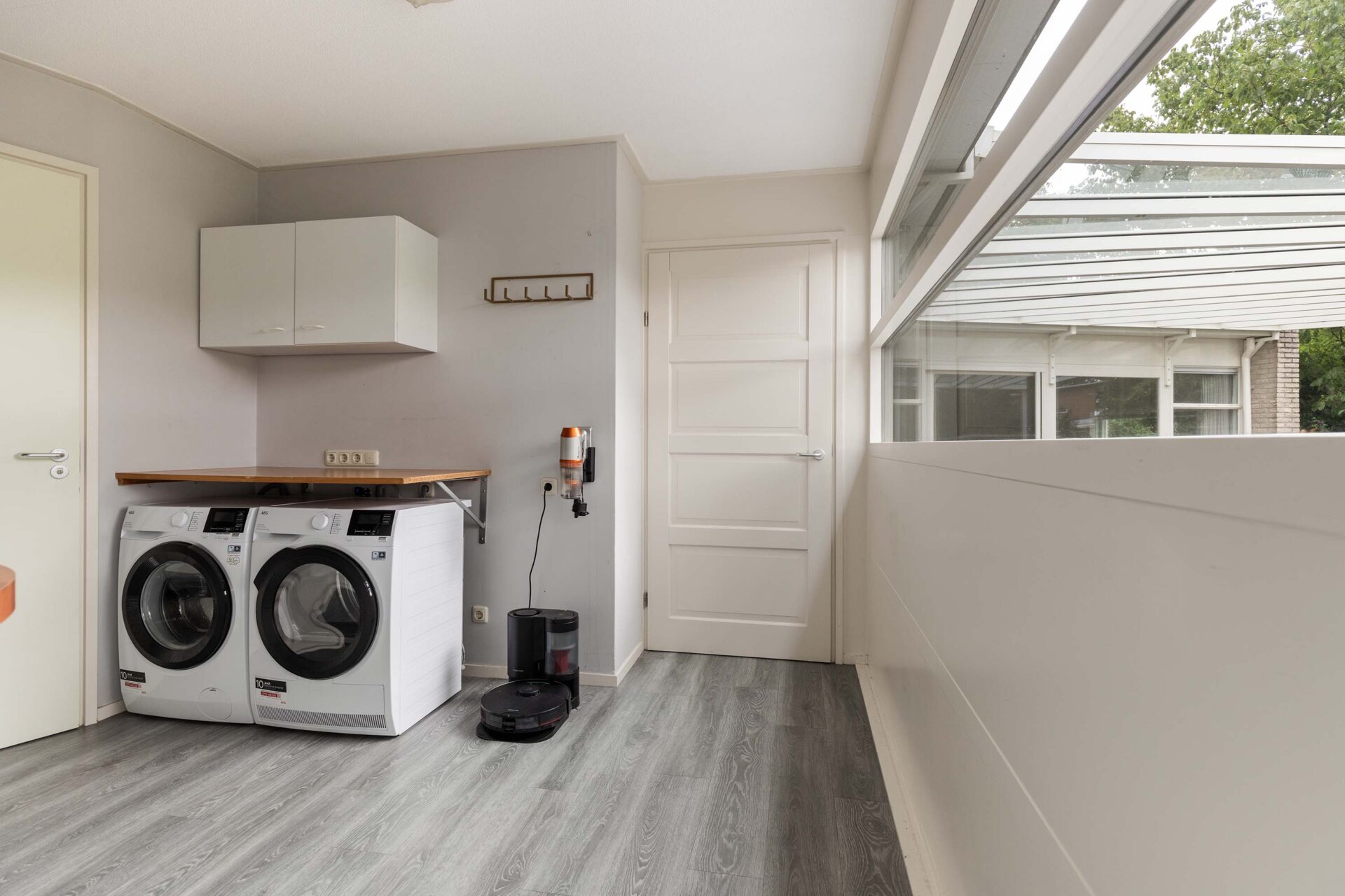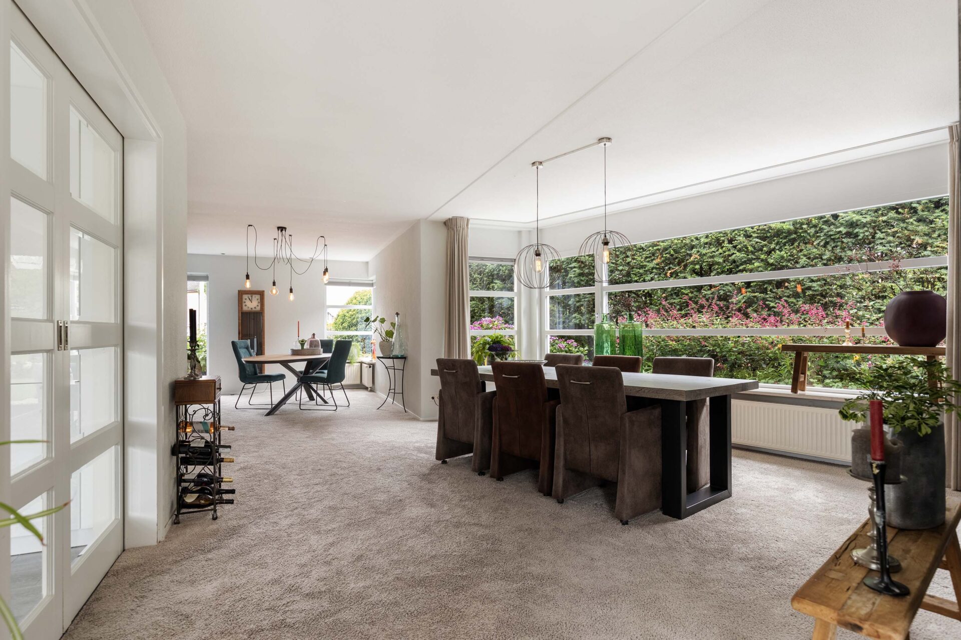 Via de ruime hal met toilet en trapopgang betreedt u de woning. De royale en lichte woonkamer heeft een unieke indeling en staat in open verbinding met de moderne keuken, welke is voorzien van diverse inbouwapparatuur. Vanuit de keuken heeft u toegang tot de bijkeuken met extra toilet. De inpandige garage is ideaal als werk- of hobbyruimte. Aan de achterzijde vindt u een ruime overkapping met glazen dak – een heerlijke plek om het hele jaar van de tuin te genieten. In de tuin bevindt zich bovendien een tweede houten overkapping voor extra beschutting en opslag van tuinmeubilair.